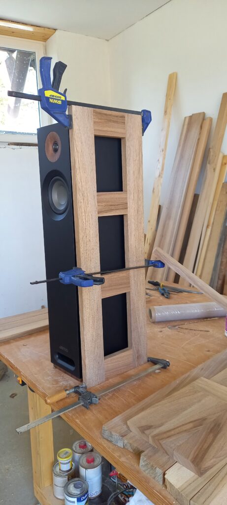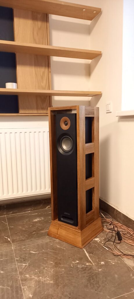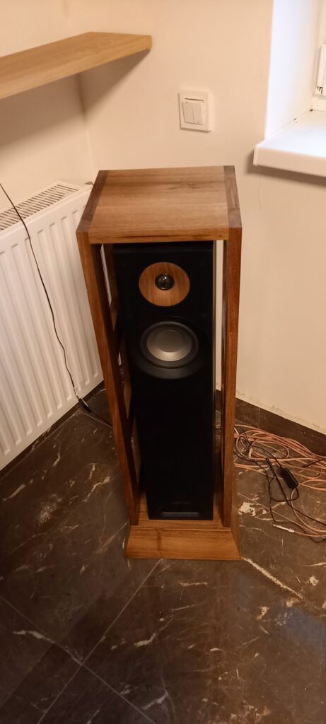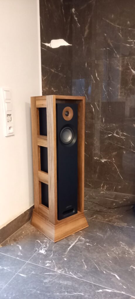 Zadání bylo skříňka na repro aby nedošlo k poškození při úklidu. Design byl docela složitý, protože repro bedna je sama o sobě designový kousek. Zvolil jsem zešikmený podstavec kvůli stabilitě a vzdušnou konstrukci. Repro samo o sobě má nízký podstavec z lamina, bohužel nalepený, který je zapuštěný do základny. Materiál vlašský ořech, povrchová úprava přírodní tvrdovosk.